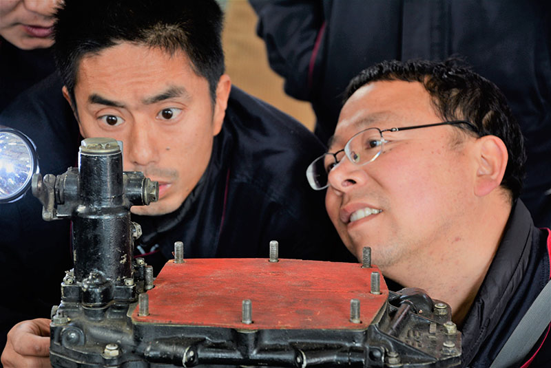 楊必武(圖右一)于2011年從學(xué)校畢業(yè)到荊門通航機(jī)務(wù)工程部從事機(jī)務(wù)維修工作,公司指派了理論基礎(chǔ)扎實(shí)、維修經(jīng)驗(yàn)豐富的機(jī)械師羅暉(圖左一)作為他的師傅。7年時(shí)間的培養(yǎng),楊必武目前已考取了維修執(zhí)照,成為機(jī)械維修隊(duì)伍中青年主力擔(dān)當(dāng)。