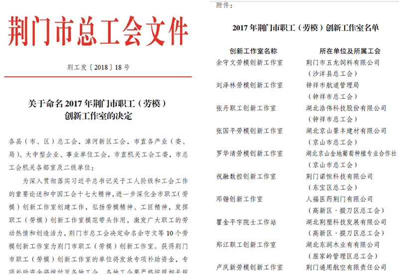 近日,荊門通航盧慶新勞模創(chuàng)新工作室順利通過荊門市總工會驗收,喜獲荊門市職工(勞模)創(chuàng)新工作室稱號。 2016 年 4 月 29 日,公司盧慶新同志被荊門市人民政府授予荊門市勞動模范
